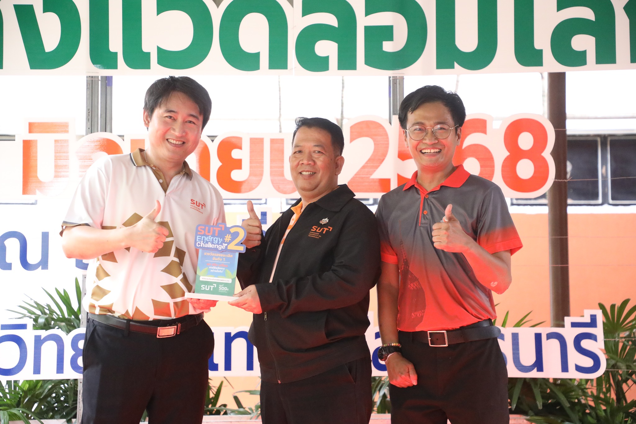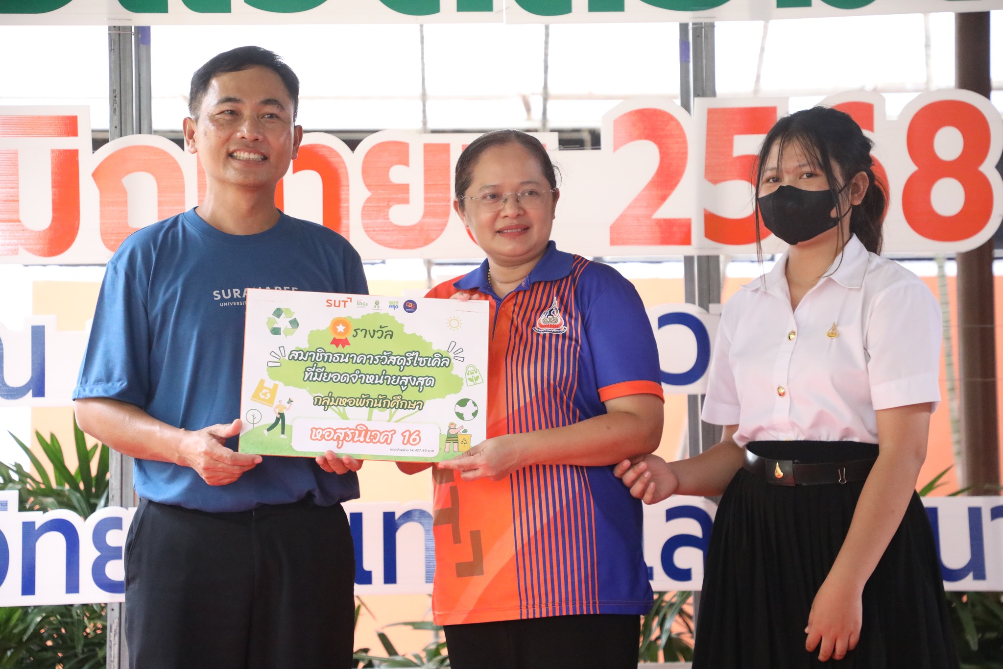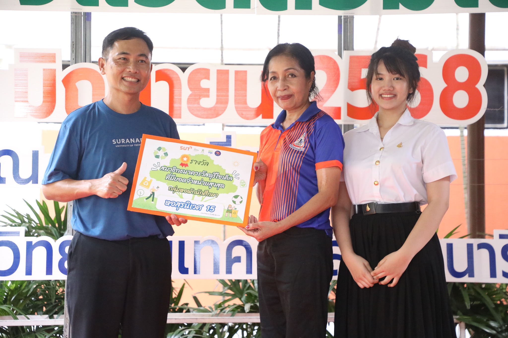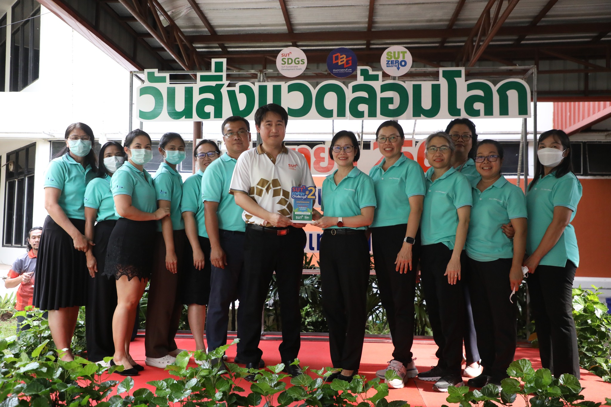 The demonstration included a practical demonstration of transforming white foam waste into concrete paving to enhance the beauty of the garden area around the integrated academic building. The event also included the launch of the "SUT Green Parking" project, a BTS Skytrain stop, awards for the top-selling recycled material bank member, the SUT Energy Challenge #2 competition for energy-saving buildings within Suranaree University of Technology, and tree-planting activities to increase green spaces around the integrated academic building. Furthermore, there was an exhibition on environmental issues and sustainable development. The event received cooperation from the Environmental Unit, Energy Management and Conservation Unit, Landscape Unit, Facilities Unit, Public Relations Unit, Student Entrepreneurship Development Center (SEDA), the Center of Excellence in Biomass, Asst. Prof. Dr. Uthai Meekham, and the Environmental Conservation Club. Importantly, all SUT students and staff who prioritize the environment participated in the activities.