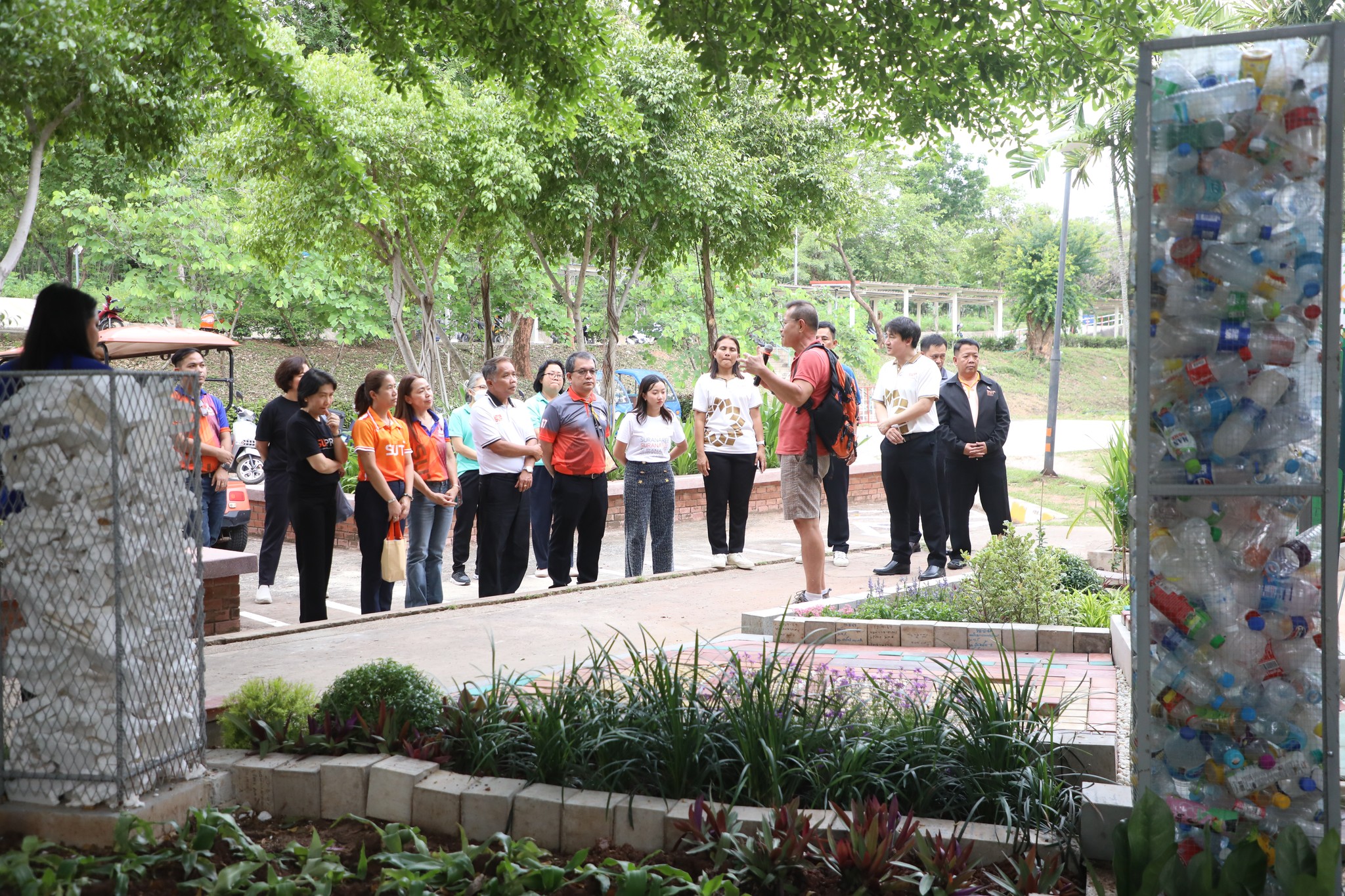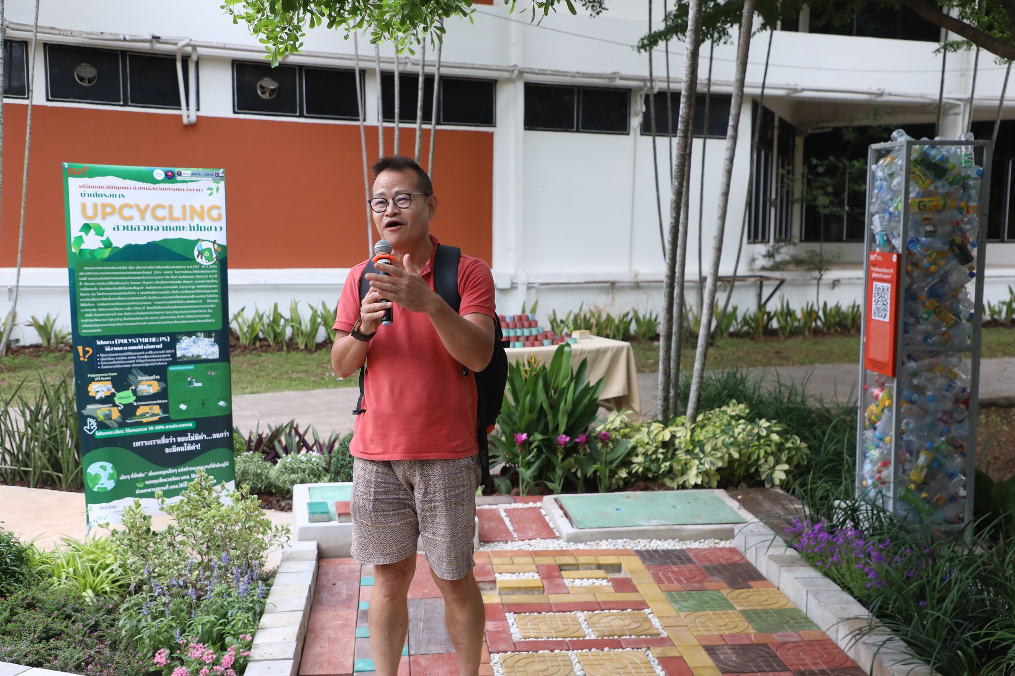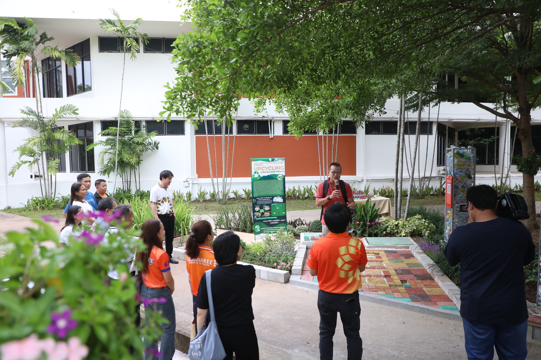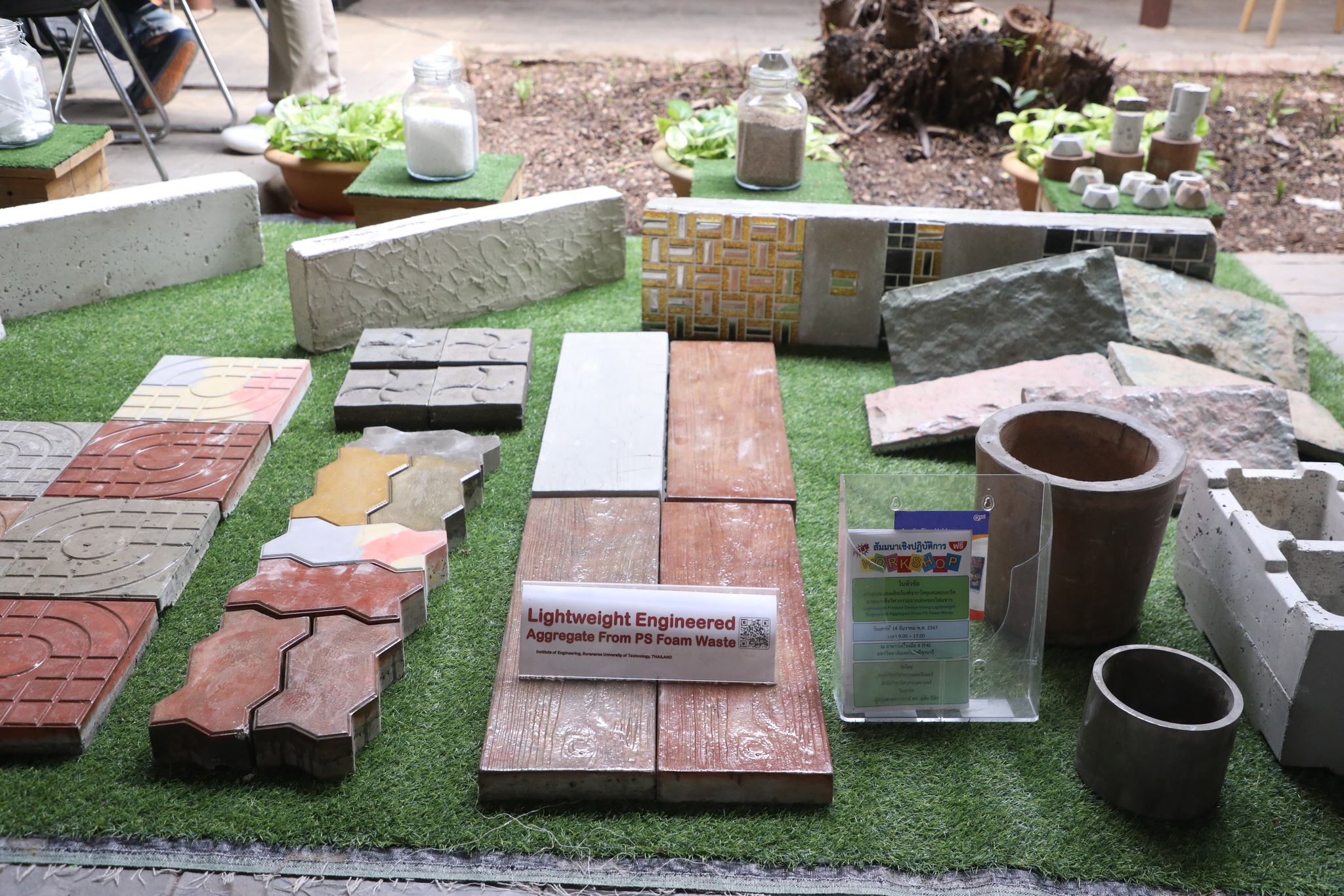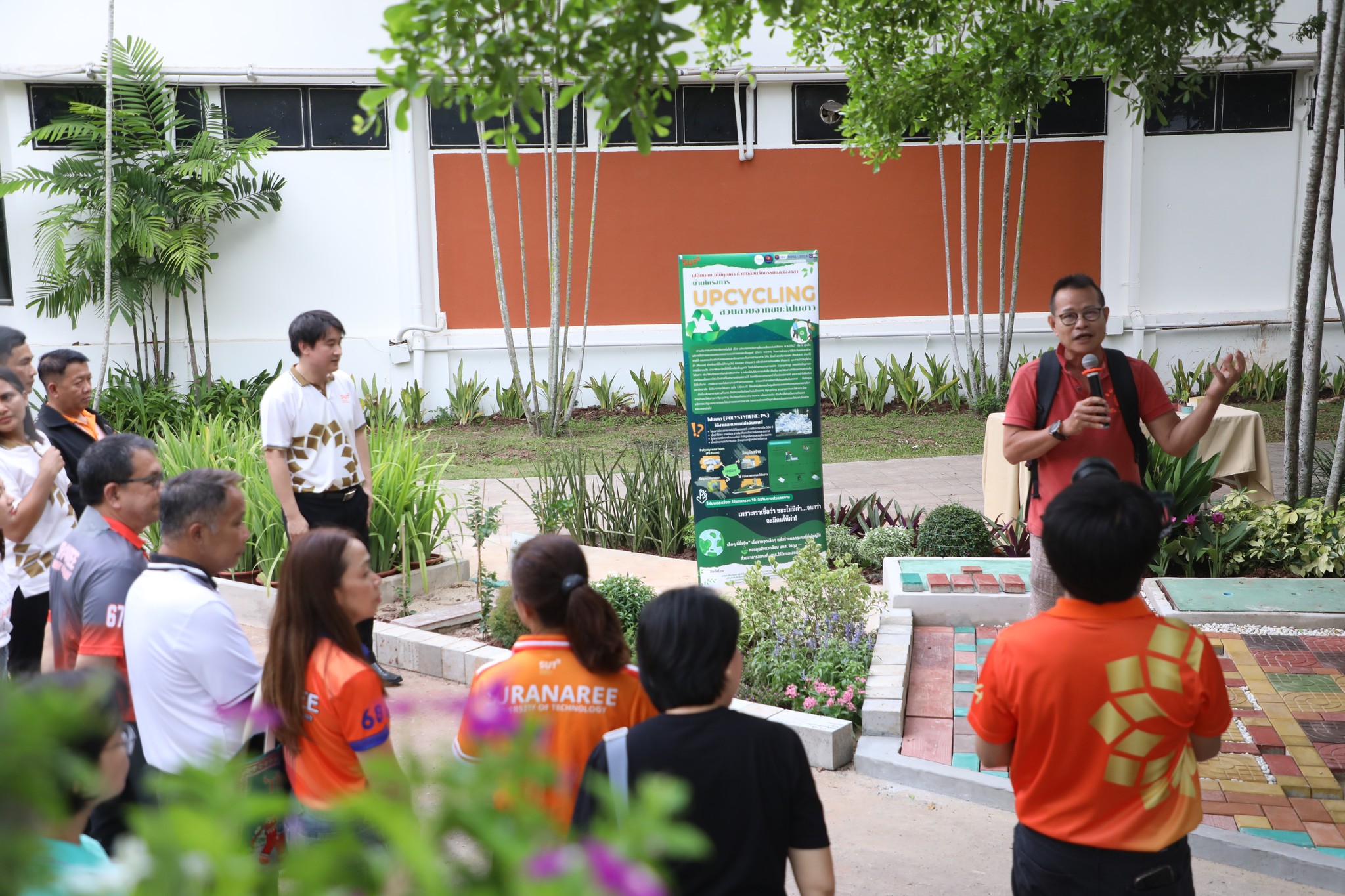 The demonstration included a practical demonstration of transforming white foam waste into concrete paving to enhance the beauty of the garden area around the integrated academic building. The event also included the launch of the "SUT Green Parking" project, a BTS Skytrain stop, awards for the top-selling recycled material bank member, the SUT Energy Challenge #2 competition for energy-saving buildings within Suranaree University of Technology, and tree-planting activities to increase green spaces around the integrated academic building. Furthermore, there was an exhibition on environmental issues and sustainable development. The event received cooperation from the Environmental Unit, Energy Management and Conservation Unit, Landscape Unit, Facilities Unit, Public Relations Unit, Student Entrepreneurship Development Center (SEDA), the Center of Excellence in Biomass, Asst. Prof. Dr. Uthai Meekham, and the Environmental Conservation Club. Importantly, all SUT students and staff who prioritize the environment participated in the activities.