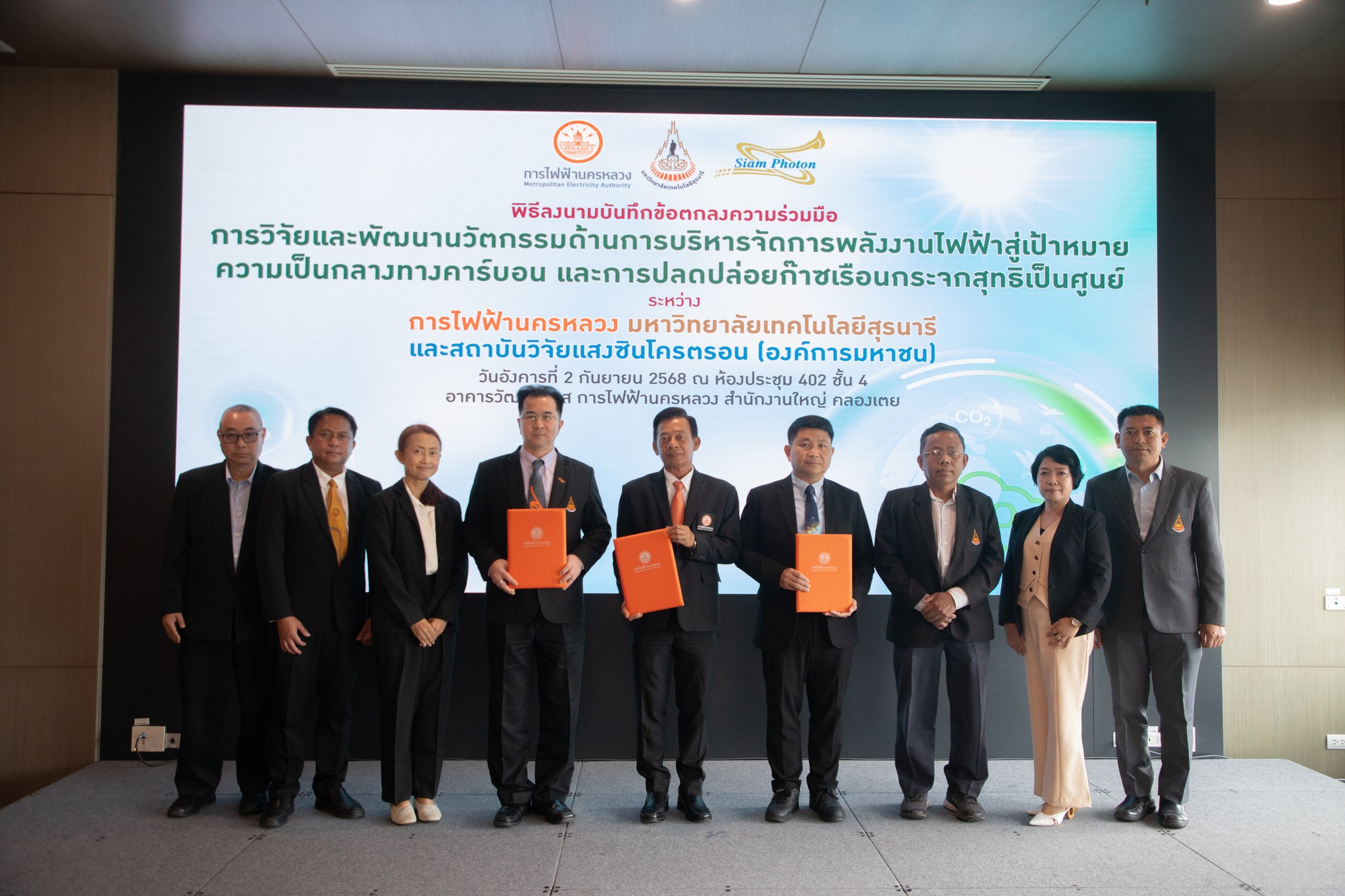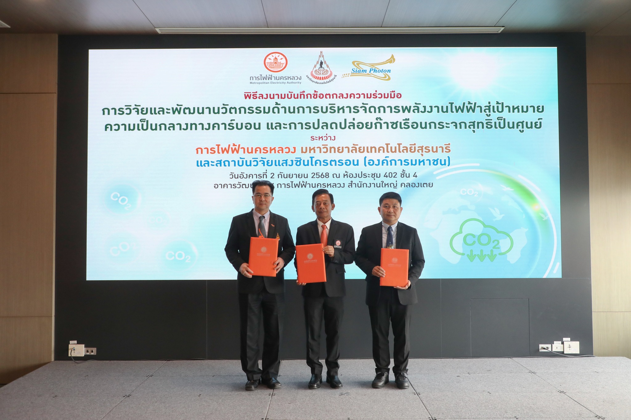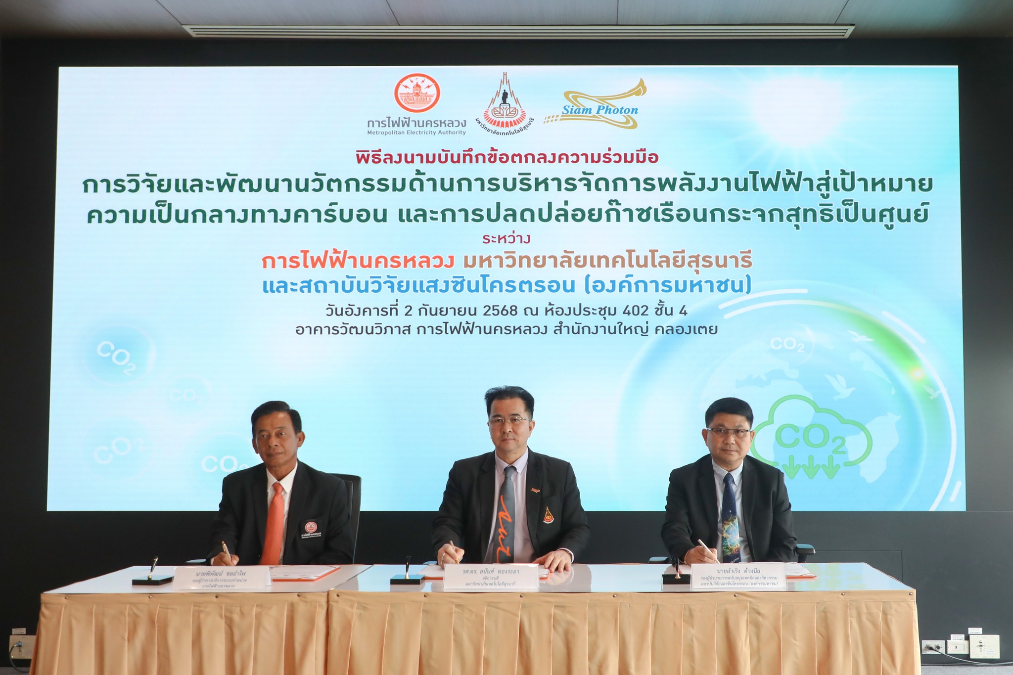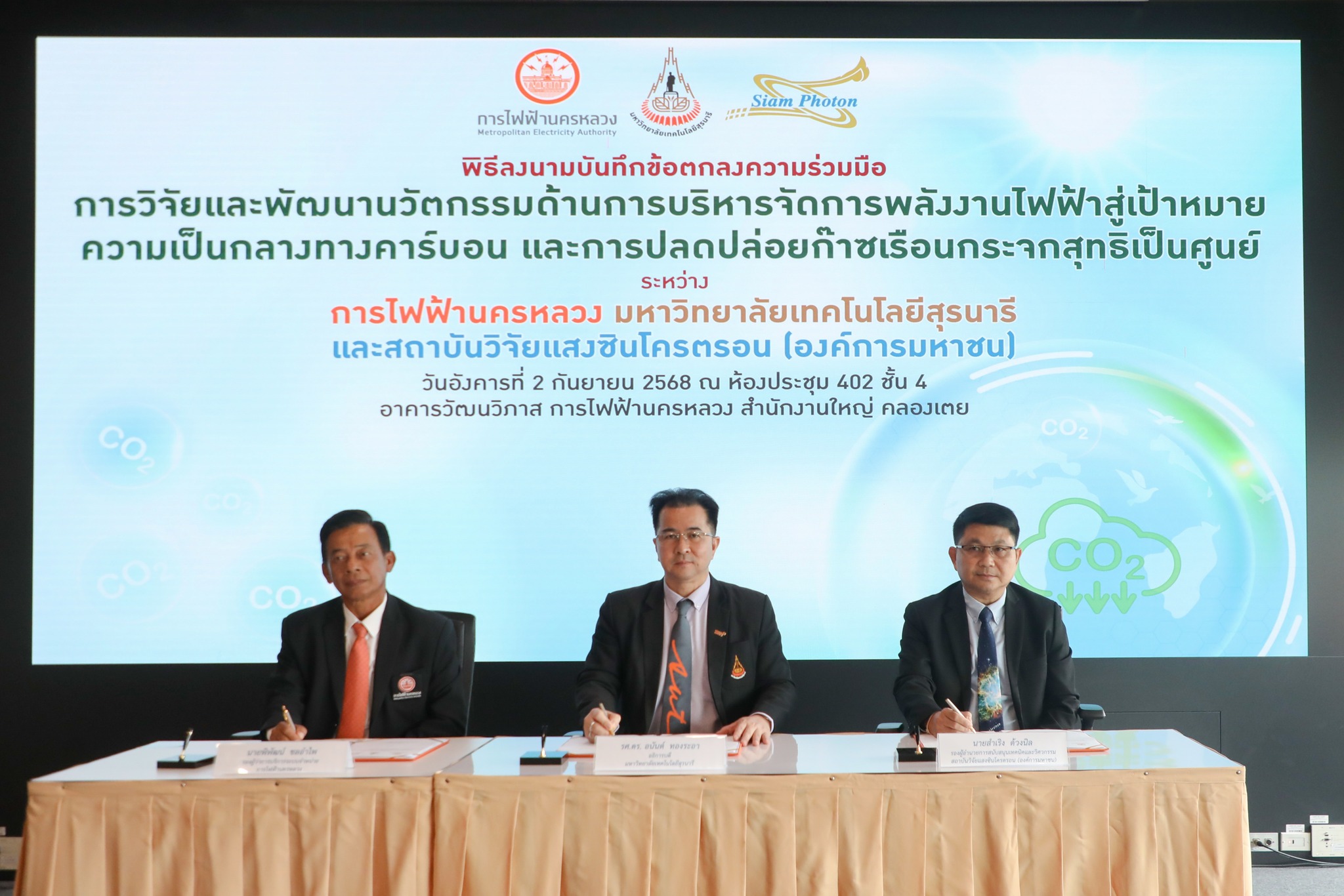 Suranaree University of Technology (SUT), in collaboration with the Metropolitan Electricity Authority (MEA) and the Synchrotron Light Research Institute (Public Organization) (SRI), signed a memorandum of understanding (MOU) on "Research and Development of Innovations in Electricity Management Towards Carbon Neutrality and Net Zero Emissions." This collaboration integrates higher education institutions, state enterprises, and national research institutions to enhance research and efficient electric power management, further advancing the resolution of Thailand's key energy and environmental issues and global challenges sustainably.