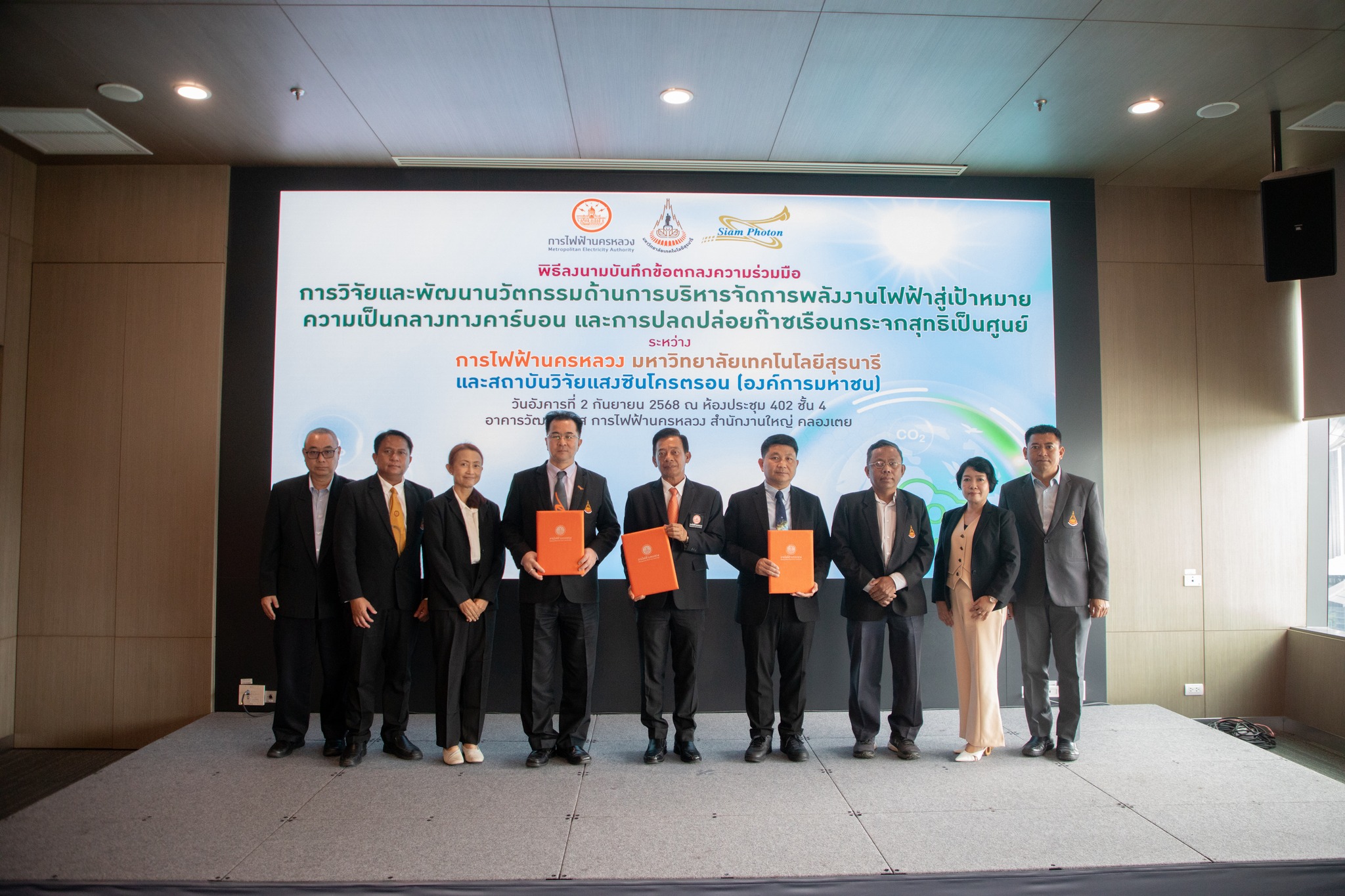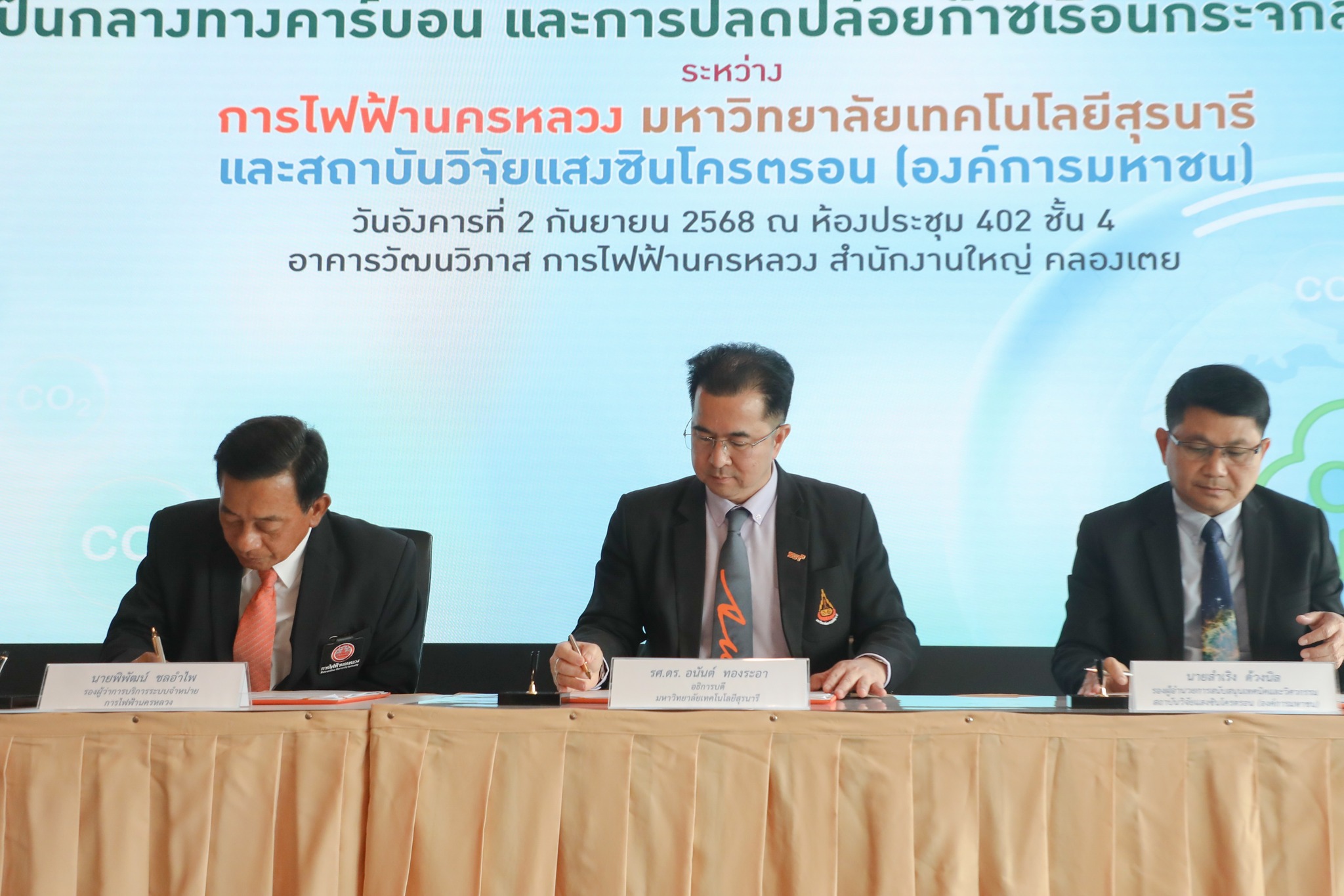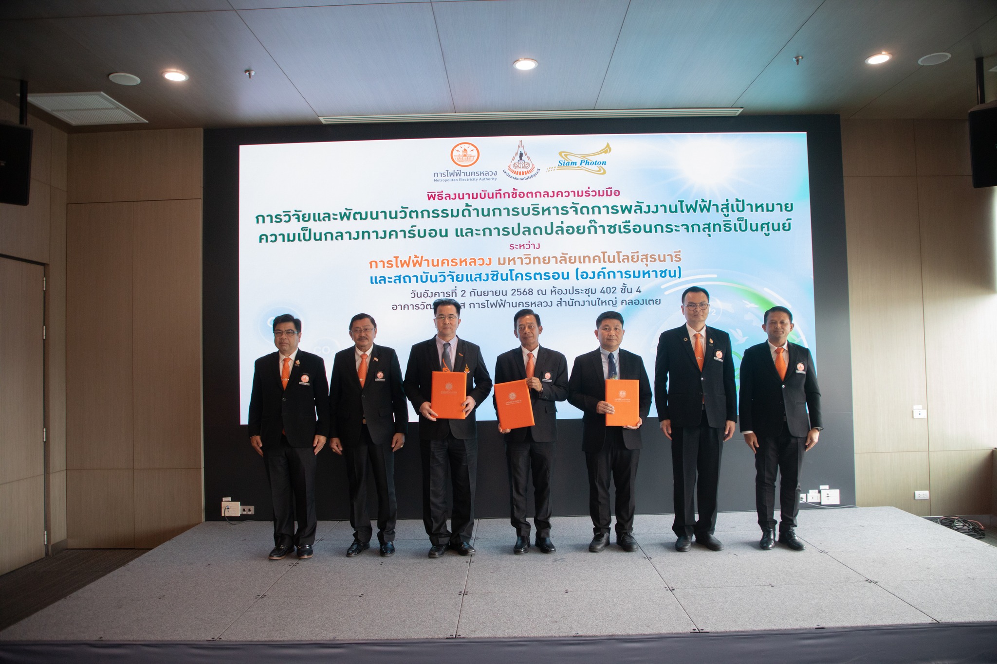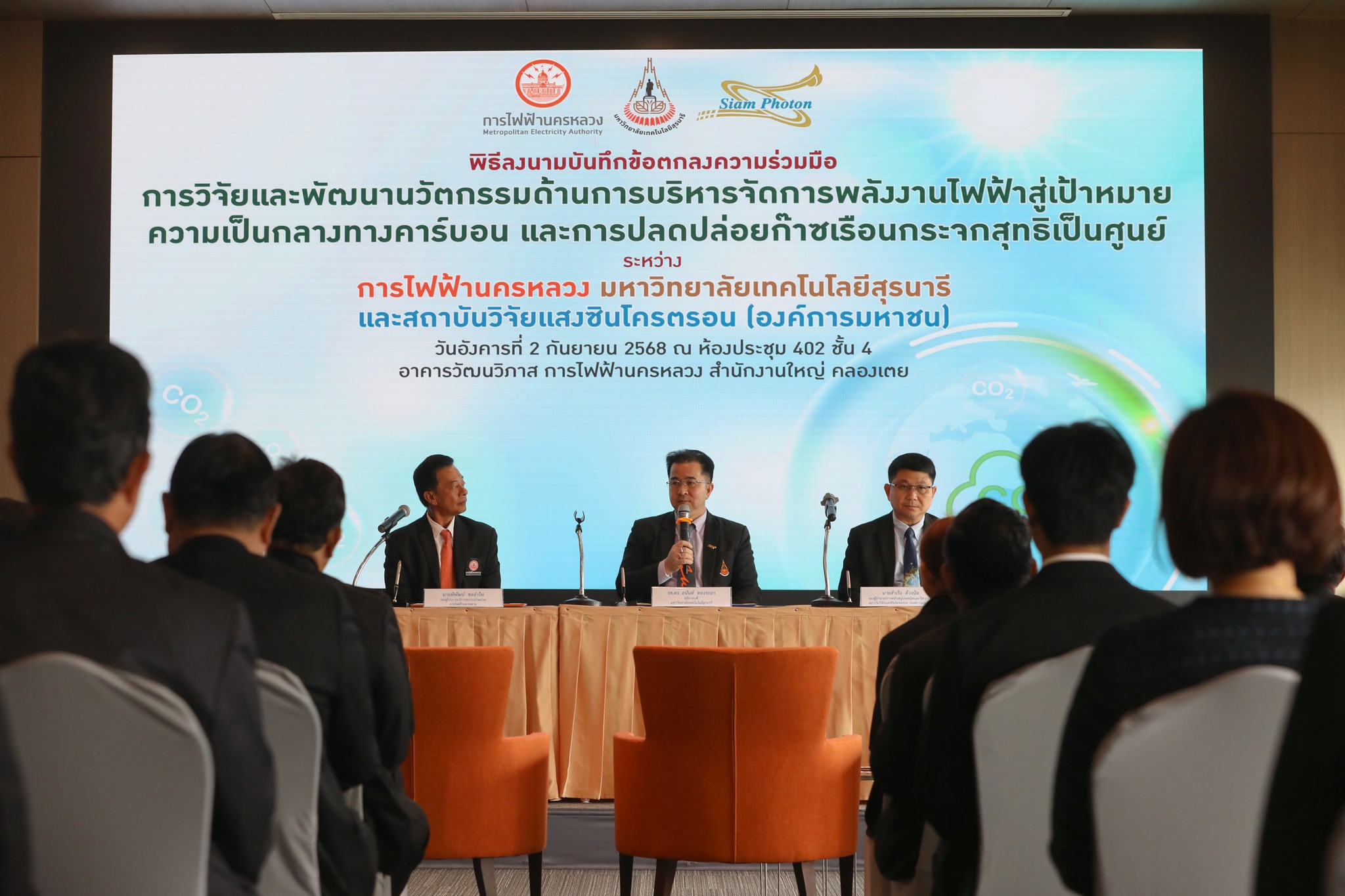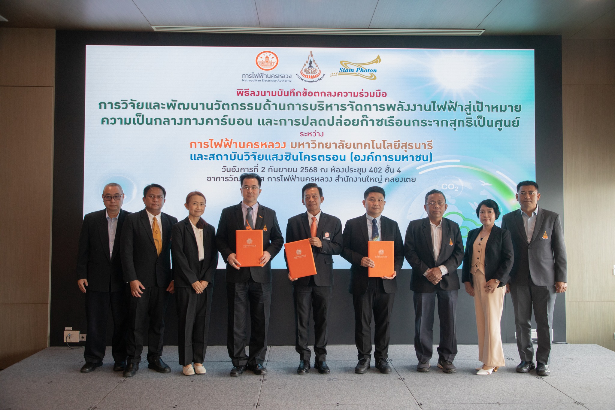 Suranaree University of Technology (SUT), in collaboration with the Metropolitan Electricity Authority (MEA) and the Synchrotron Light Research Institute (Public Organization) (SRI), signed a memorandum of understanding (MOU) on "Research and Development of Innovations in Electricity Management Towards Carbon Neutrality and Net Zero Emissions." This collaboration integrates higher education institutions, state enterprises, and national research institutions to enhance research and efficient electric power management, further advancing the resolution of Thailand's key energy and environmental issues and global challenges sustainably.