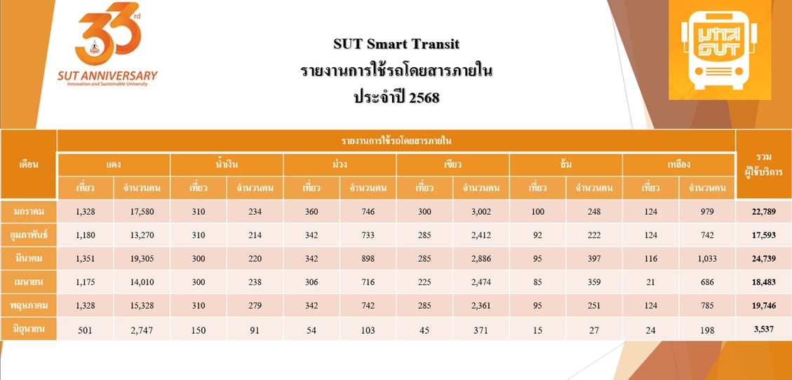 available from 07.00 - 21.00 hrs. You can log in to "Real-time SUT BUS location" at http://203.158.3.33:8080/dashboard/1a7ef880-fa93-11ef-94ed-973314b03447?publicId=44a00910-fa93-11ef-94ed-973314b03447